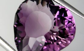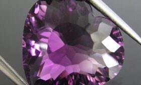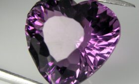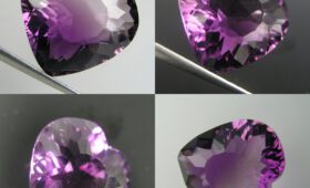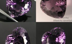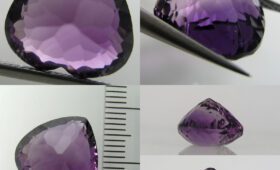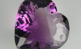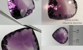 Velký, přírodní ametyst vysoké kvality s atraktivním, sytým, i když lehce nerovnoměrným odstínem fialové. Při běžném pohledu není barevná nerovnoměrnost prakticky patrná a po zasazení, zejména v uzavřeném klenotnickém osazení, se barevný tón zcela sjednotí. Kámen má dobrou čistotu a byl ručně vybroušen do složitého konkávního brusu ve tvaru srdce, který mu dodává bohatou jiskru a výraznou brilanci. Pro ametyst je typická i jemná barvoměna.