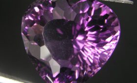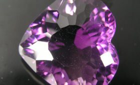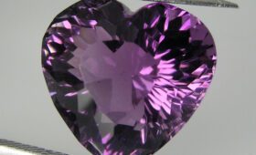 Velký, přírodní ametyst vysoké kvality s atraktivním, sytým, i když lehce nerovnoměrným odstínem. Při běžném pohledu není toto rozložení barvy výrazně patrné a po zasazení, zejména v uzavřeném typu, se barva opticky sjednotí. Kámen má dobrou čistotu a byl ručně broušen do silně jiskřivého, složitého konkávního brusu ve tvaru srdce. Pro ametyst typická barvoměna je přítomná.