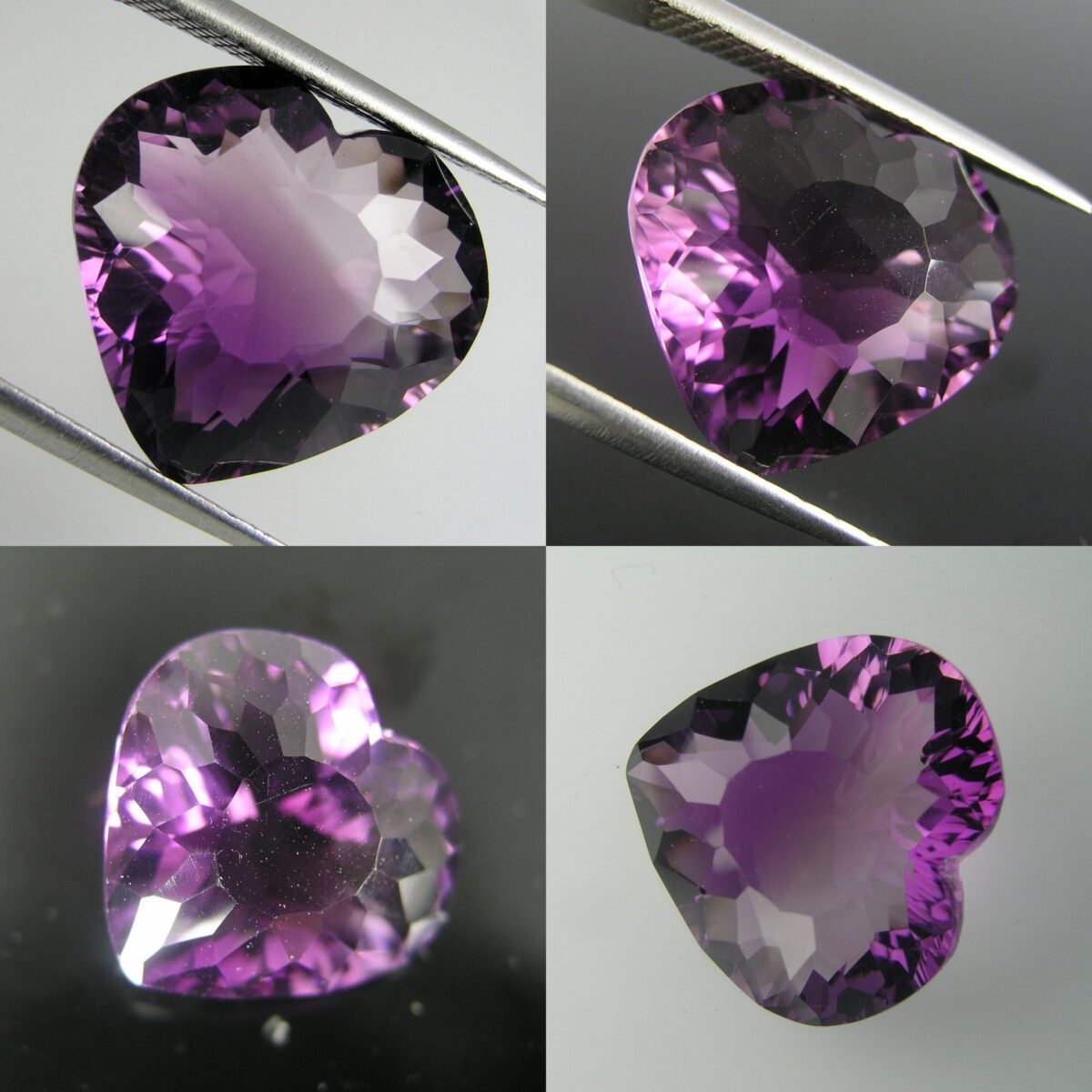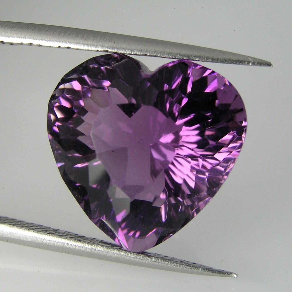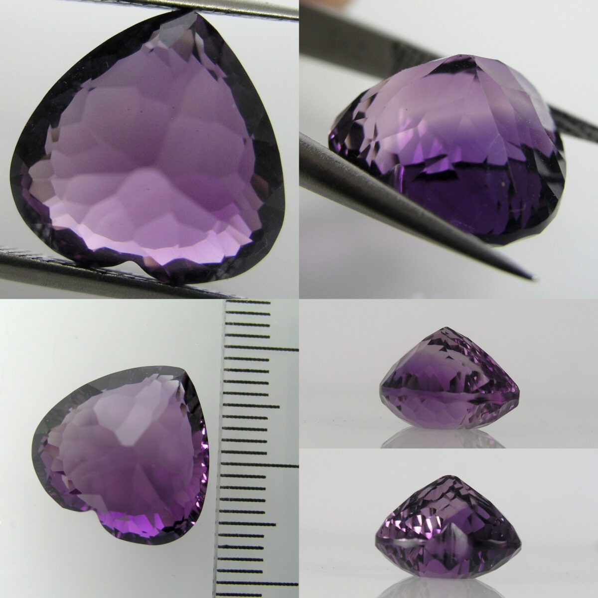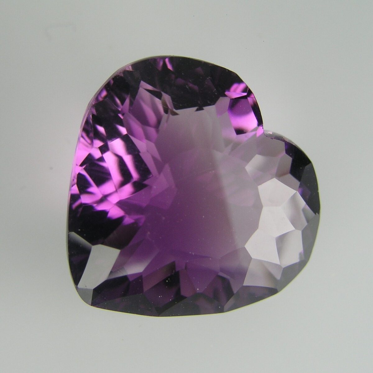 Velký, přírodní ametyst vysoké kvality s atraktivním, sytým, i když lehce nerovnoměrným odstínem. Při běžném pohledu není toto rozložení barvy výrazně patrné a po zasazení, zejména v uzavřeném typu, se barva opticky sjednotí. Kámen má dobrou čistotu a byl ručně broušen do silně jiskřivého, složitého konkávního brusu ve tvaru srdce. Pro ametyst typická barvoměna je přítomná.