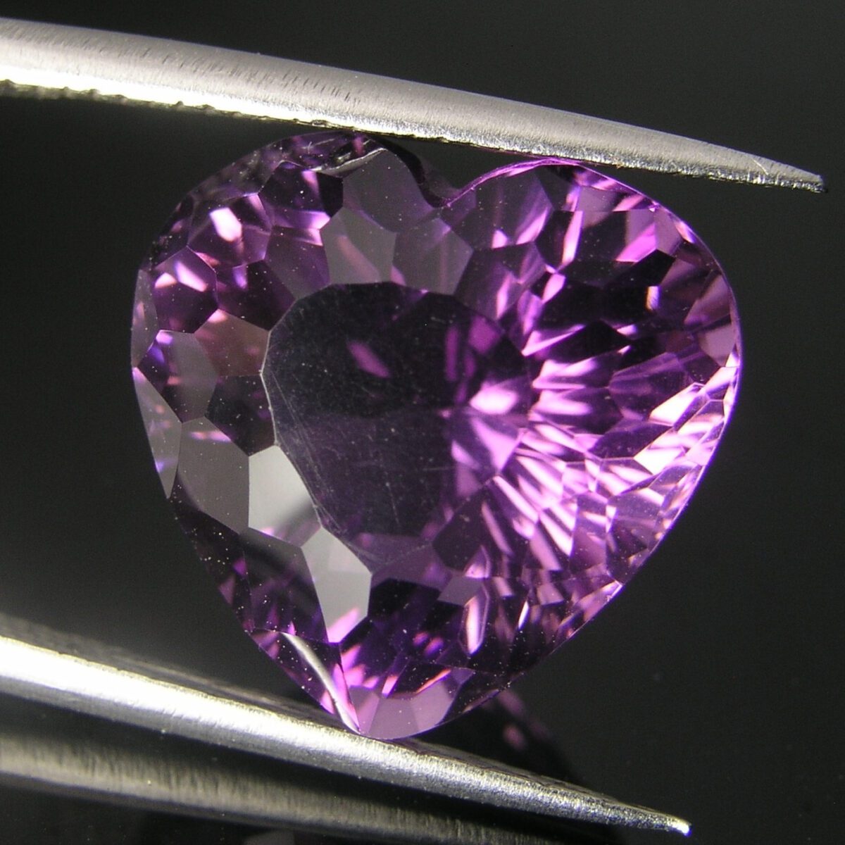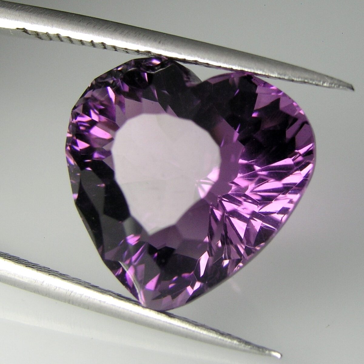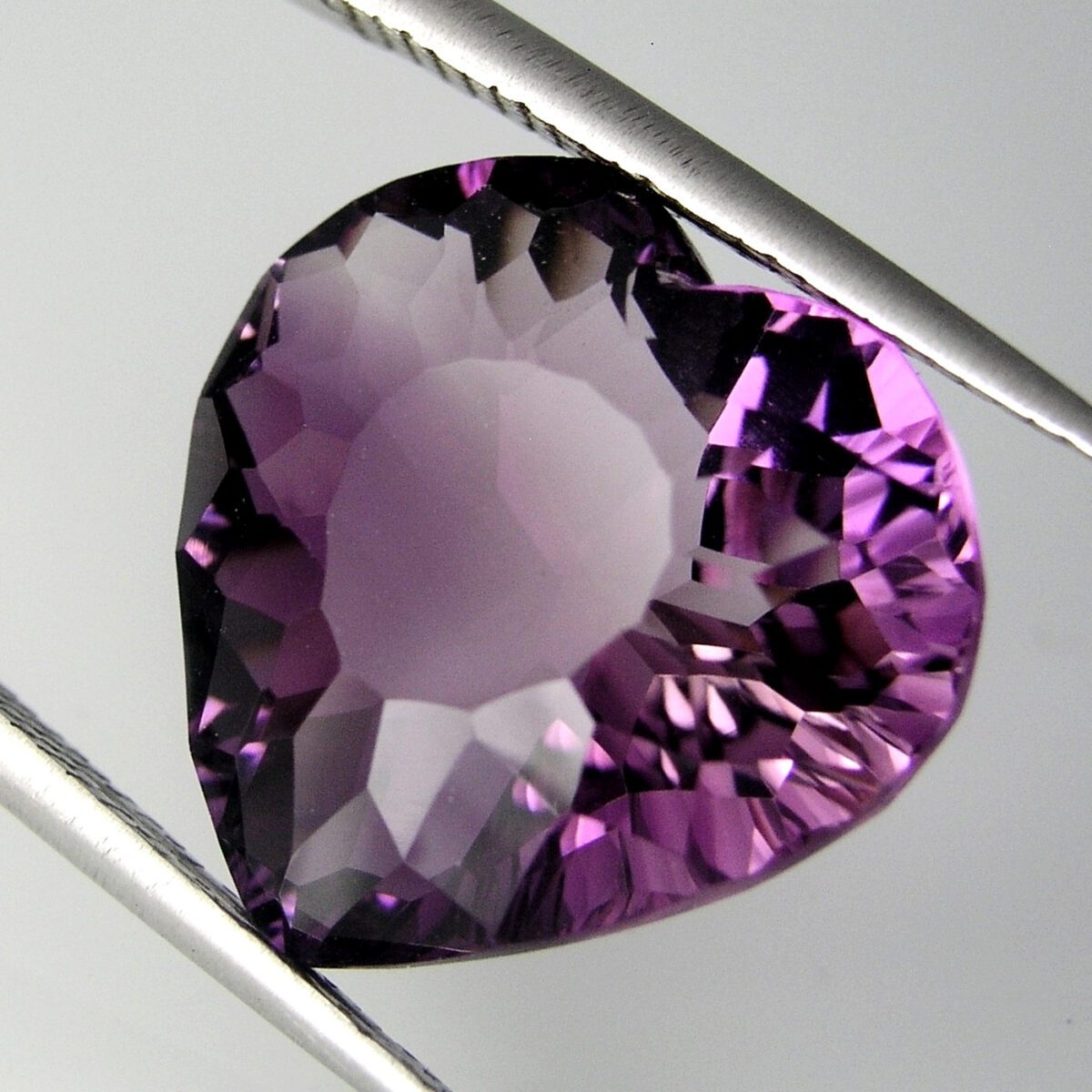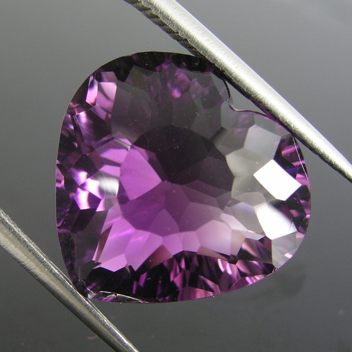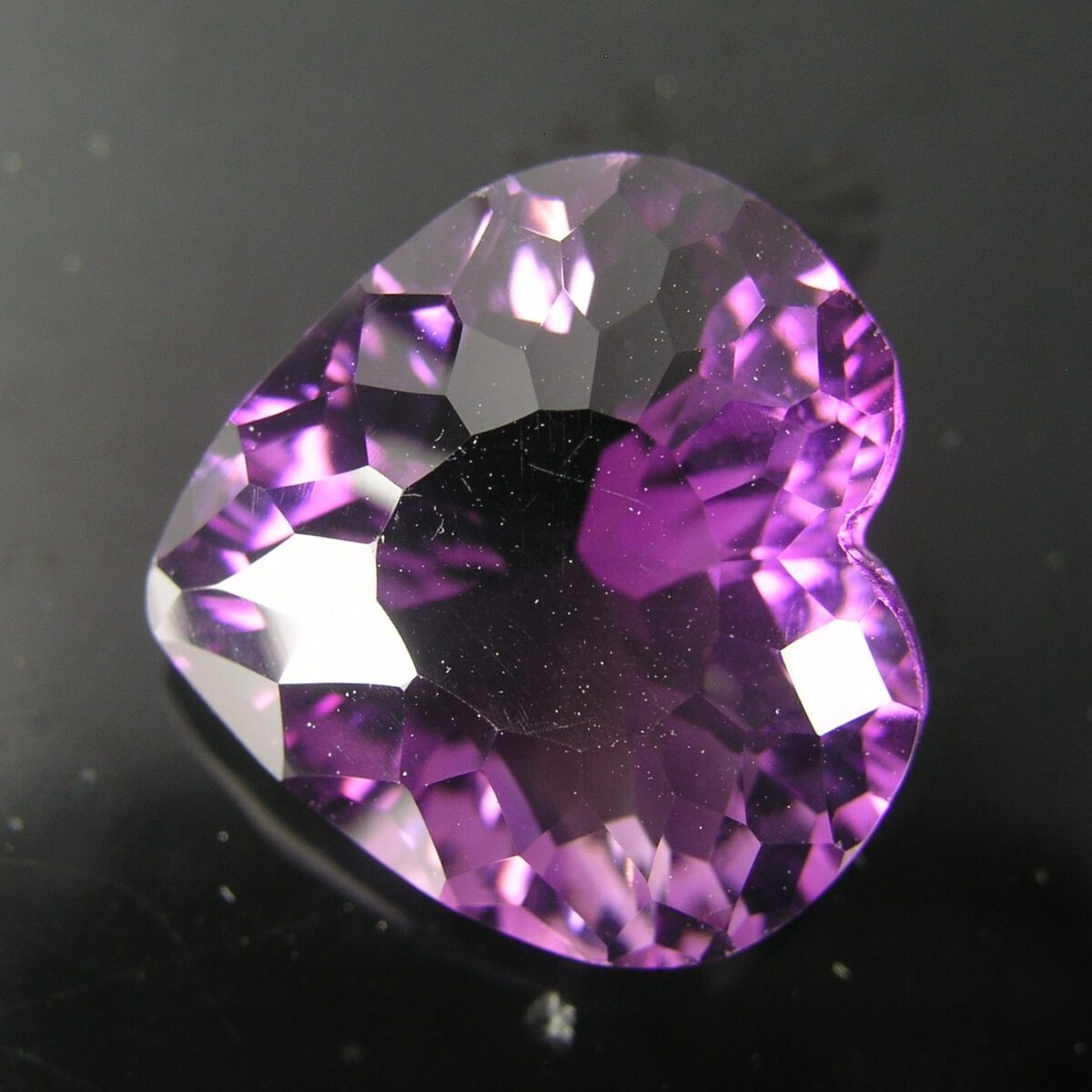 Velký, přírodní ametyst vysoké kvality s atraktivním, sytým, i když lehce nerovnoměrným odstínem. Při běžném pohledu není toto rozložení barvy výrazně patrné a po zasazení, zejména v uzavřeném typu, se barva opticky sjednotí. Kámen má dobrou čistotu a byl ručně broušen do silně jiskřivého, složitého konkávního brusu ve tvaru srdce. Pro ametyst typická barvoměna je přítomná.