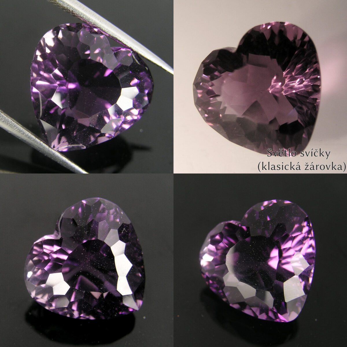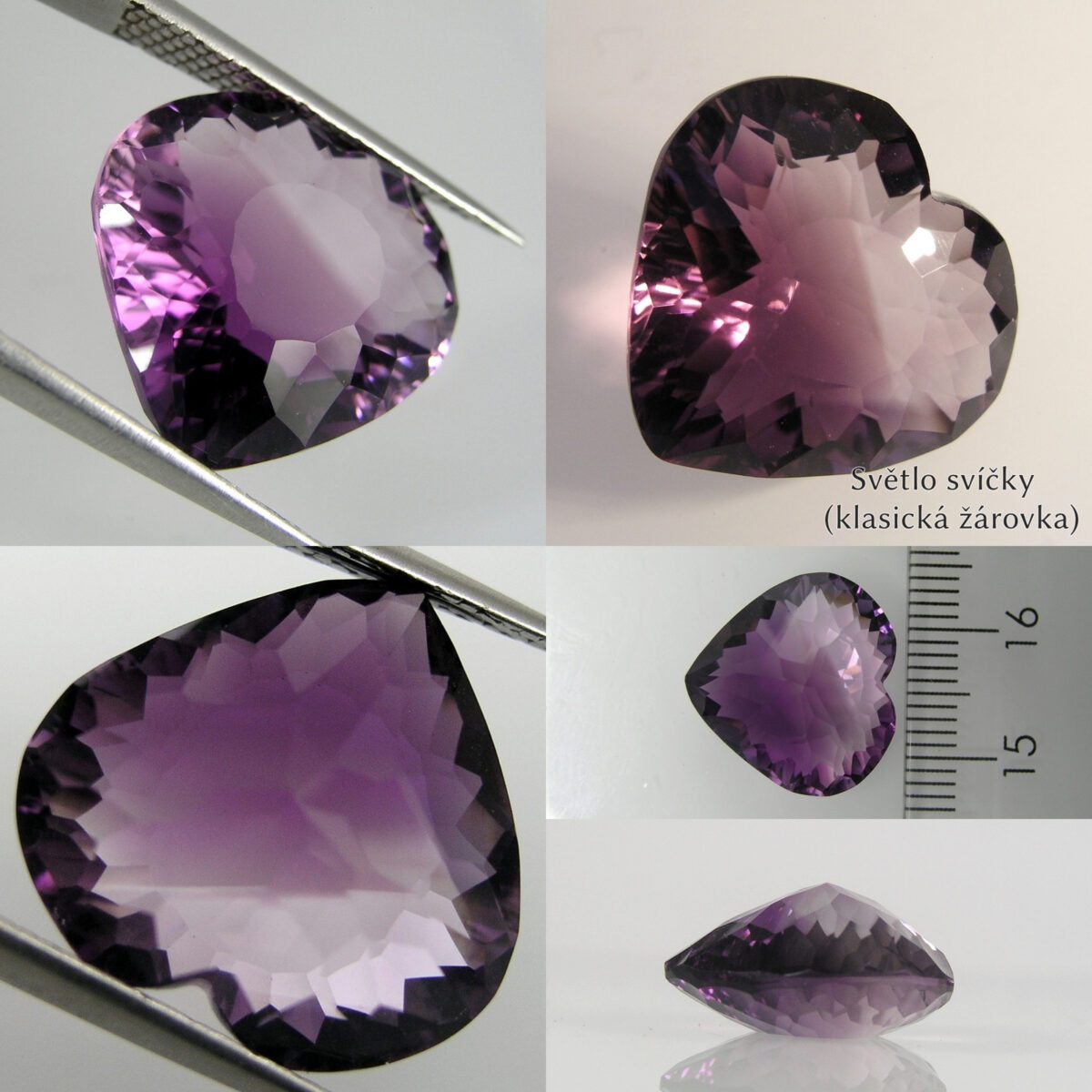 Velký, přírodní ametyst vysoké kvality s atraktivním, sytým, i když lehce nerovnoměrným odstínem fialové. Při běžném pohledu není barevná nerovnoměrnost prakticky patrná a po zasazení, zejména v uzavřeném klenotnickém osazení, se barevný tón zcela sjednotí. Kámen má dobrou čistotu a byl ručně vybroušen do složitého konkávního brusu ve tvaru srdce, který mu dodává bohatou jiskru a výraznou brilanci. Pro ametyst je typická i jemná barvoměna.