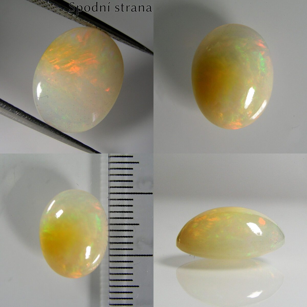 Kabošon přírodního drahého opálu pocházející z etiopského naleziště, který zaujme velmi dobrou průhledností a jemným přírodním základním odstínem. Největší ozdobou tohoto kamene je však jeho intenzivní a bohatá barvohra, jež se projevuje v široké paletě odstínů – od převládající oranžovo-červené, přes zelené, až po jemné záblesky žluté a modré. Tento působivý optický efekt je patrný v celém kameni a dodává mu živost a atraktivitu, díky níž je každý pohled na něj jedinečný.