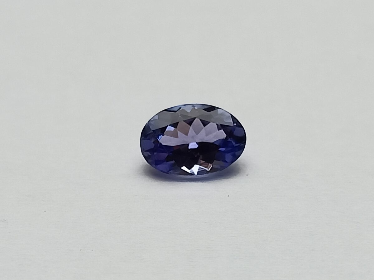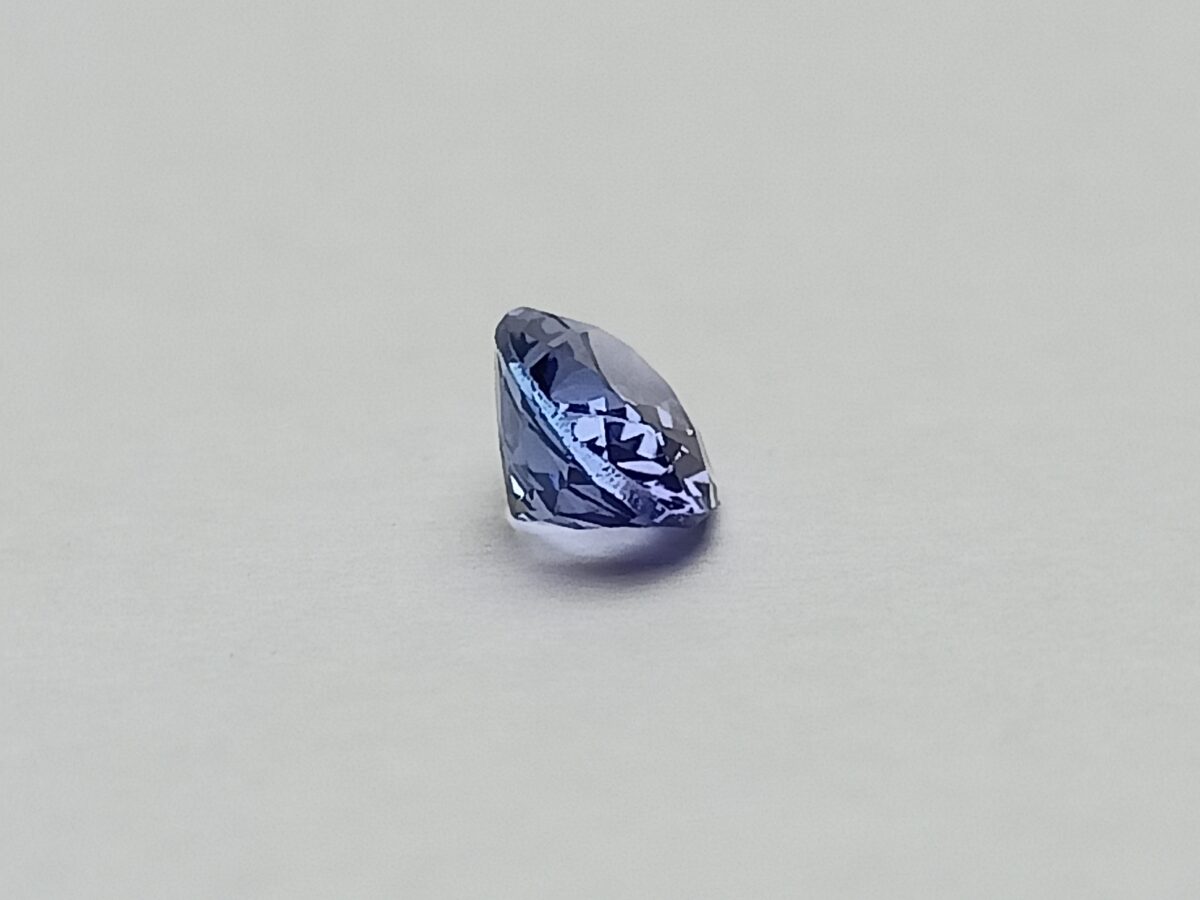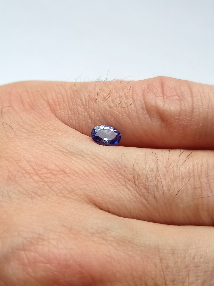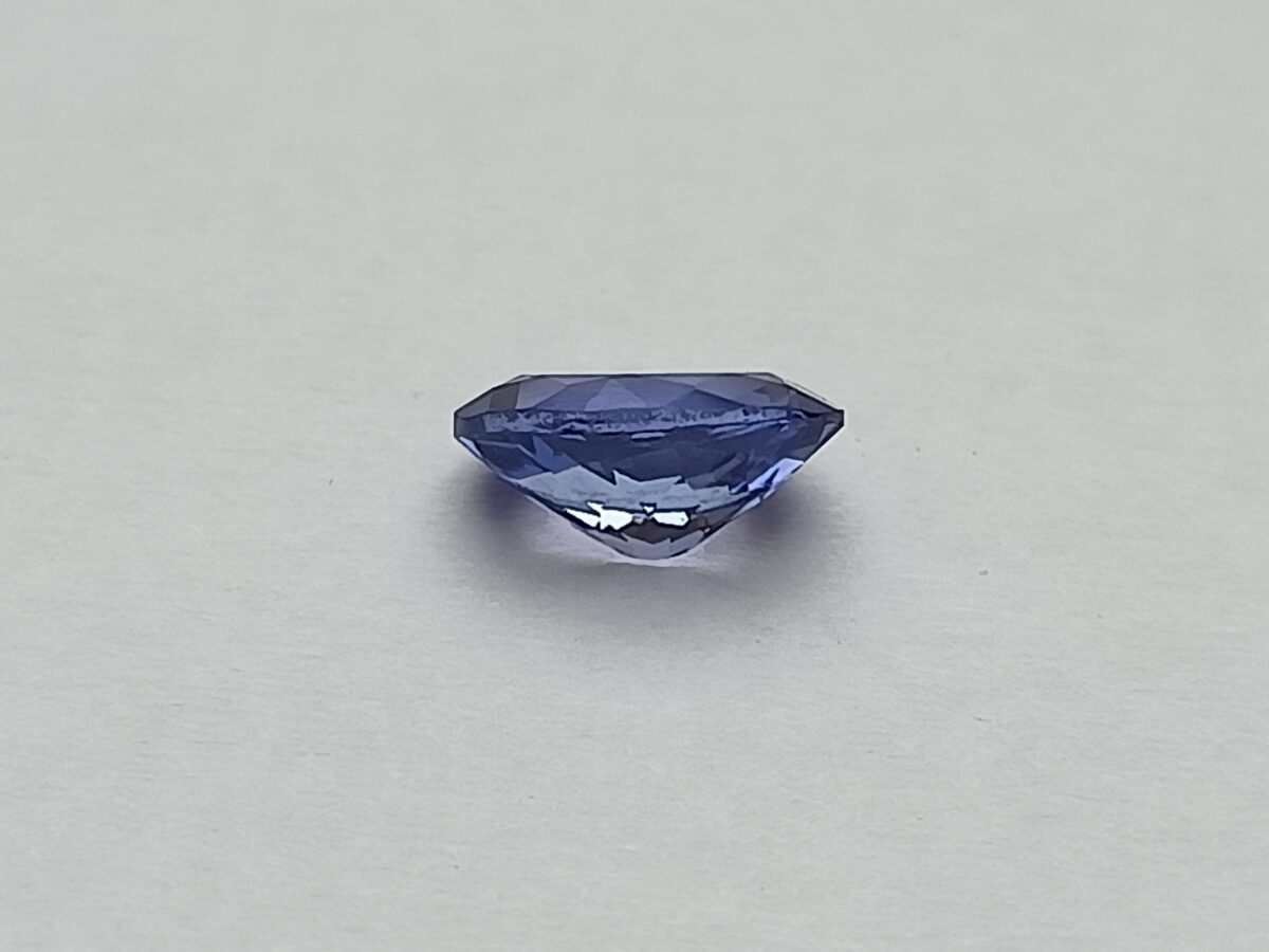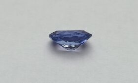 Broušený, přírodní Zoisit – Tanzanit z tanzanského naleziště s atraktivním, tmavě fialovo-modrým odstínem a krásnou vnitřní hloubkou barvy. Kámen má výjimečnou čistotu IF, bez okem i lupou patrných inkluzí, a velmi pěknou, živou jiskru danou modifikovaným briliantovým brusem.